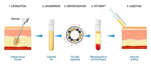 پالایش و پردازش (Processing): چربی برداشت شده برای جداسازی ناخالصیها، سلولهای آسیبدیده، خون و مایع بیحسی پردازش میشود تا یک گرافت (بافت زنده) چربی خالص و زنده به دست آید. روشهای متعددی مانند سانتریفیوژ، فیلتراسیون یا شستشو برای این منظور وجود دارد.